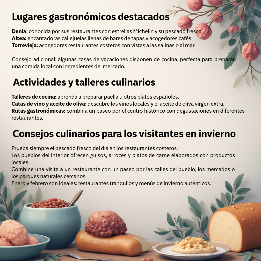 La Costa Blanca presume de una gastronomía rica y variada, con restaurantes de prestigio -y calidad-, con denominación de origen, donde la cocina mediterránea se expresa en toda su plenitud.